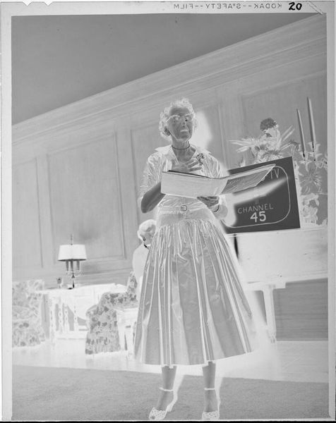 Curator: This photograph, simply titled "Untitled (woman sitting in chair in living room)," is by C. Bennette Moore. It's part of the Harvard Art Museums collection. Editor: It feels like a still from a play, doesn't it? The way the light pools, the stagey backdrop...it's wonderfully artificial. Curator: It certainly evokes a constructed reality. The formality of the wood panelling clashes with the casual pose of the sitter. Editor: That chair! It's like a golden throne shrunk down for a doll. And her shoes! One pink, one not...delightfully rebellious. Curator: The image, measuring about 7 by 5 inches, allows a surprisingly intimate view into a domestic space. The objects on the shelves suggest a life well-lived, yet curated. Editor: I wonder what story she's rehearsing in her head. This photograph feels like the pause right before the curtain rises. Curator: The image invites us to consider the roles we perform and the spaces we inhabit. Editor: It’s a fascinating little snapshot of a life that could be real, or a beautifully crafted fiction.