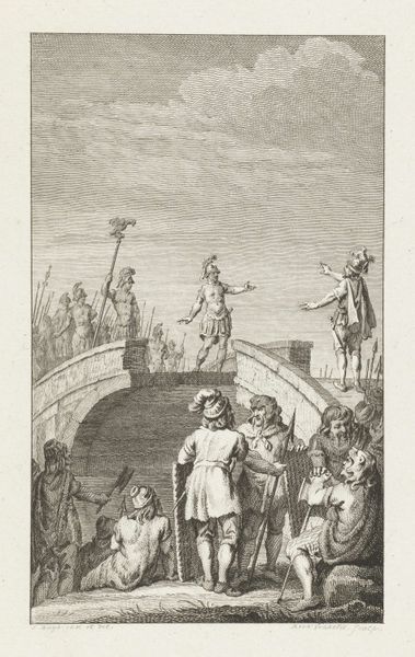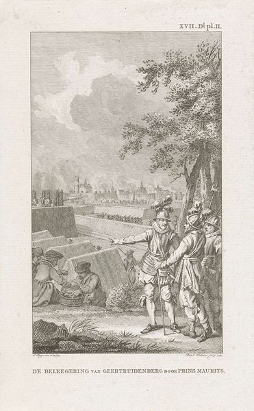 Editor: So this is "Prins Maurits in het leger voor Geertruidenberg, 1593", a pen and ink drawing made between 1785 and 1787 by Jacobus Buys. It depicts a siege. The monochromatic ink wash gives it a rather somber mood. What do you see here? Curator: I see a potent confluence of ambition, history, and the psychology of leadership etched in ink. Look at how Buys captures Prince Maurits' posture: the forward-pointing gesture, the steady gaze, almost a symbolic embodiment of Dutch resolve. Do you notice how he’s positioned slightly apart from his officers, yet connected by that implied line of sight? Editor: Yes, I see what you mean. There’s a sense of detachment and connection at the same time. The figures seem to be participating in something grander. Curator: Precisely! Buys is using Maurits as a cultural icon. The siege of Geertruidenberg wasn't just a military maneuver; it became a symbol of Dutch resilience. Think about the weight that images of leadership, like Maurits here, carry through generations. Buys is participating in shaping how his contemporaries remember and interpret their history. How does the overall landscape impact the feel of the picture? Editor: Well, it seems to emphasize the scale of the siege, maybe? All those sharp angles…the buildings feel almost menacing. Curator: They speak to both opportunity and threat, the core dialectic of any conflict, whether in war or in one's own life. It also speaks to Romanticism, with the detailed rendering of historical events. Ultimately, do you think it helps in preserving that memory? Editor: Definitely. I hadn't considered how powerful symbols could be and how art contributes to a nation's shared identity. Thanks! Curator: It’s a dance between what we see, what we remember, and what we choose to carry forward.