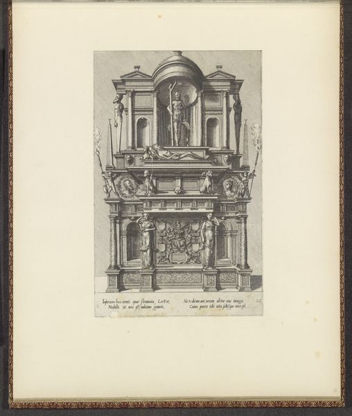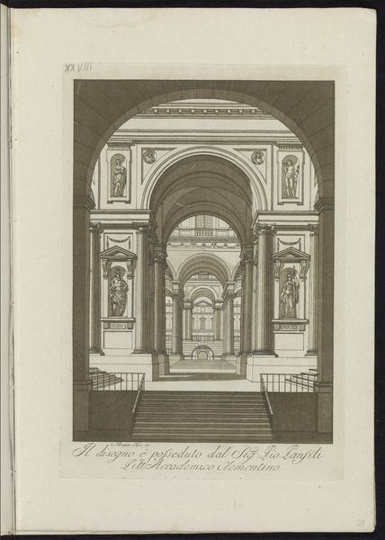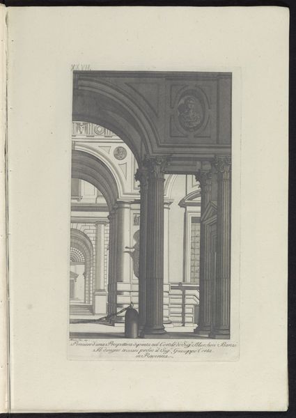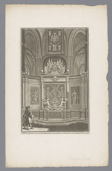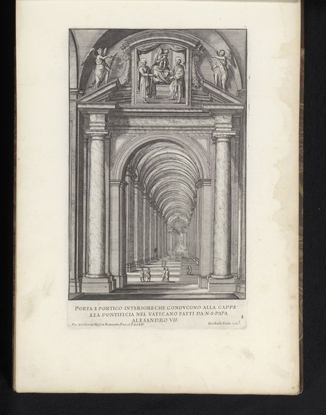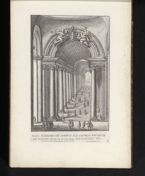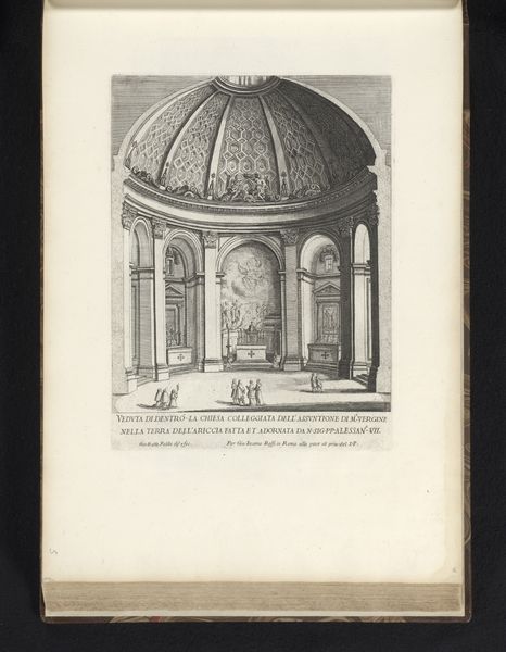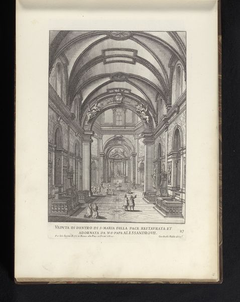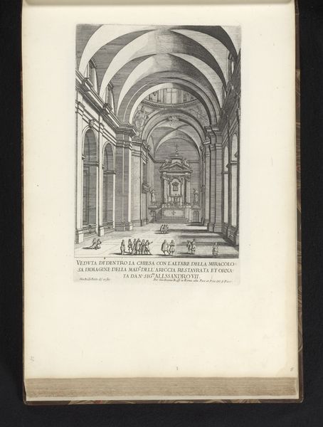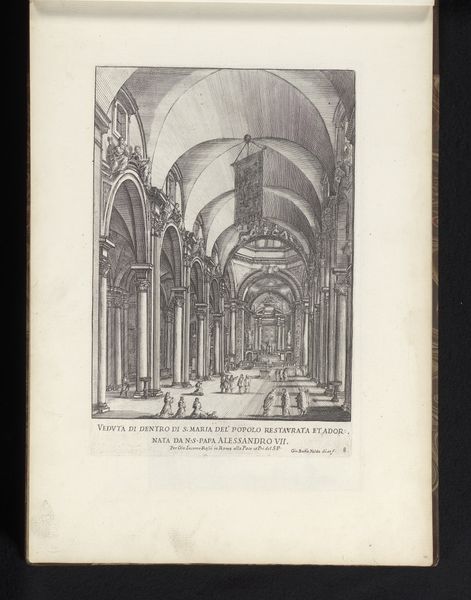 Editor: This is "Interieur van de kerk de Collegiata di San Tommaso da Villanova," an engraving from sometime between 1665 and 1667 by Giovanni Battista Falda, currently held at the Rijksmuseum. It's a wonderfully precise depiction of a church interior. What strikes me most is how the lines almost vibrate with light. What do you see in this piece? Curator: It's as though Falda’s pen danced across the page, isn't it? For me, beyond the architectural precision – and believe me, that's a feat in itself! – I sense a real invitation to stillness. The figures are small, almost dwarfed by the space. It makes me think about our place in something much larger. Does it evoke that for you, too? That feeling of being part of a grand, almost overwhelming design? Editor: I see that. The small figures create a sense of perspective, emphasizing the grandness. So, is it about religious experience? Curator: Perhaps, or perhaps it's more broadly about the experience of awe. Think about the Baroque period, its love of drama and grandeur, how these architectural spaces were designed to inspire precisely that feeling. It’s less about dictating belief and more about instilling a sense of wonder, right? Editor: That makes a lot of sense. I was so focused on the detail that I missed that bigger picture of…well, the bigger picture. Curator: Art's funny like that. It whispers until you decide to really listen, right? Editor: Absolutely. This has made me see the print completely differently. Thank you!