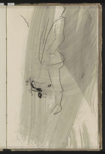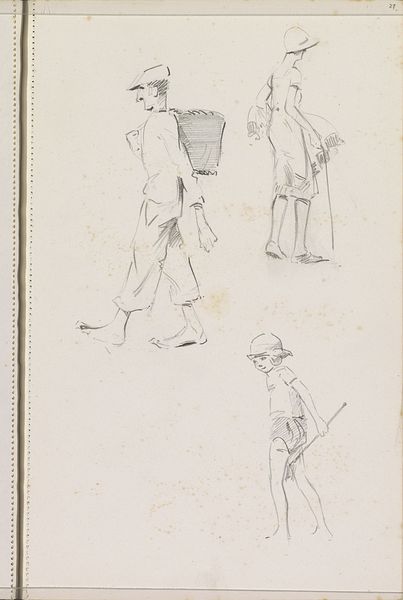 Curator: Before us, we have Otto Verhagen's "Vrouw met een parasol, man met een juk en een wandelend stel," a work from around 1928-1930, rendered with pencil and colored pencil on paper. What strikes you first about it? Editor: The feeling is transient; these figures appear sketched, capturing a fleeting moment. Are these figures observed, remembered, or conjured from the artist's imagination? The rapid strokes seem intended to capture essence rather than detail. Curator: Indeed, observe the artist's handling of line and form. Verhagen utilizes a restricted palette and abbreviated strokes to articulate volume and spatial relationships, focusing the viewer's eye on essential qualities and subtle chromatic interplay. Editor: I'm compelled to consider the social landscape implied here. The title gives us the figures’ descriptions instead of any identities. What roles might these figures occupy? Who is afforded leisure, and who bears the weight of labor? I’m intrigued by the parasol's symbolic meaning. Curator: Excellent point. The parasol acts as both a formal element creating an interesting circular form and a symbol within the broader composition. Notice, too, how the lines vary in thickness and direction to create depth and texture despite the minimalist approach. It is particularly visible when viewing the image in full. Editor: And that yoke, though barely rendered, signifies the physical burden of labor, juxtaposed against the strolling couple who embody privilege. What socioeconomic narratives are encoded in these choices? Is this work pointing to the stark class differences of its time? Curator: Regardless of one's position on the socioeconomic dimension, one has to recognize the technical prowess on display here. Verhagen successfully conveys an atmosphere with minimal mark-making; a pure expression of modern economy in style. Editor: Absolutely, its open composition allows viewers to bring their own meanings and reflections into it. For me, that incompleteness, that lingering possibility for meaning, amplifies its power. It holds within it untold narratives of gender, class, and daily experience, offering space to ponder lives and realities beyond my own. Curator: Precisely, Verhagen has, perhaps unintentionally, laid down elements that provoke thought and visual pleasure. A compelling study of modern form, with a delightful human touch.