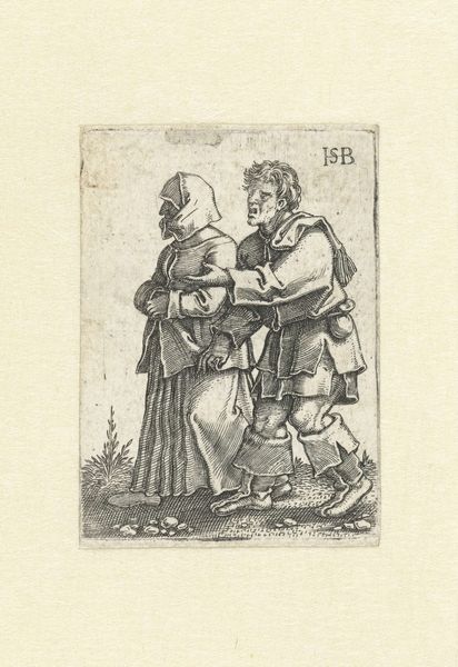 Curator: Welcome. Today we're looking at Salvator Rosa's etching, "Three warriors conversing at a low wall, one with his back turned, from the series 'Figurine'," dating from about 1651 to 1661. It is part of the collection at the Metropolitan Museum of Art. Editor: There's an immediate intimacy to this scene. Despite their armor and weapons, the sketchy quality evokes a feeling of candid observation. The dense, cross-hatched shading creates such a dramatic effect; everything seems so dark yet vulnerable. Curator: The ‘Figurine’ series explores types rather than individuals, presenting archetypal figures. Warriors, philosophers, bandits. They embody distinct aspects of human experience. The posture of the figure turning away is particularly powerful. Rosa is not showing us a triumphant hero, but a man, caught in the complexities of decision and reflection. The turned back also hints at secrets and veiled allegiances. Editor: Rosa's use of line here is so interesting. The etching medium lends itself well to conveying texture—the cold, hard armor, the rough stone of the wall. Observe how light is used not realistically but emotionally, dramatically. This highlights areas while concealing others, which definitely contributes to the overall tone. Curator: The narrative art here goes beyond simple history painting. Rosa utilizes symbolic figuration, drawing upon long-standing cultural associations of the warrior figure with strength, loyalty, but also with conflict, and often, tragedy. These aren't just figures in armor, they are symbols burdened with the weight of historical narratives. Editor: True. The arrangement is interesting, too. They’re grouped together tightly, as if conspiring, the figure in the center as the main anchor, both visually and perhaps even narratively. In regards to the composition I like the contrast of hard lines to the soft. Curator: I agree, Rosa seems less interested in objective rendering and more interested in imbuing his figures with symbolic resonance and revealing inner turmoil. These figures almost function like a kind of melancholic memory. Editor: I find myself drawn in by this seemingly simple etching technique. What began as mere line, transforms into something profound, that reflects the cultural symbolism and history in Baroque art. Curator: Ultimately, Rosa offers a fascinating interplay between the personal and the historical, reminding us how individual lives become intertwined with the sweeping currents of history and human conflict.