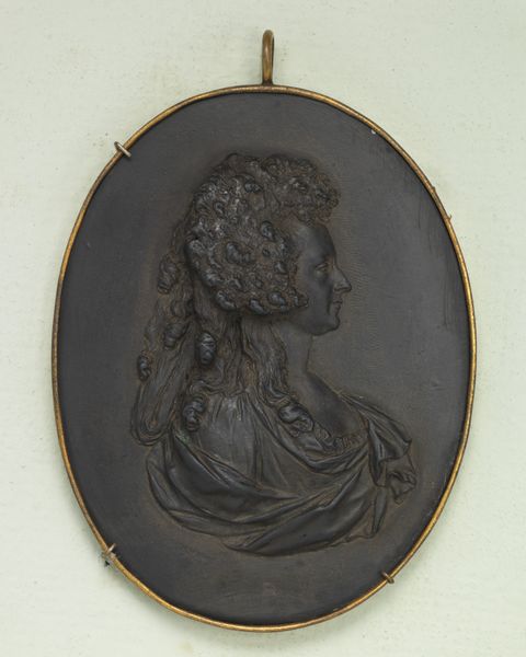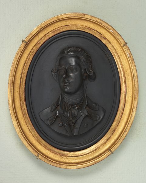 Editor: Here we have James Tassie’s 1791 ceramic and glass portrait of "Jean, wife of John Adam." It's a very formal profile view and the stark white against black gives it such a severe, neoclassical feel. What do you see in this piece beyond its aesthetic qualities? Curator: Beyond aesthetics, it presents a window into 18th-century constructions of gender and domesticity. Consider the societal roles expected of women like Jean Adam, largely confined to the domestic sphere and defined by their marital status. This portrait, while seemingly celebrating an individual, also reinforces those societal constraints. Do you notice anything in her clothing, or rather the representation of it, that strikes you? Editor: The cap and high neckline certainly suggest modesty and restraint. But the frills and delicate details seem almost…aspirational? Curator: Precisely. It's a visual encoding of bourgeois respectability. These aren’t just clothes; they're signifiers of social standing and adherence to prevailing moral codes. Tassie, through this careful rendering, isn’t merely capturing a likeness; he’s participating in the construction of an ideal. What questions does that raise for you about portraiture in general? Editor: It makes me wonder about the power dynamics at play. Whose gaze is being privileged? And what stories might be silenced in the process of creating these idealized images? Curator: Exactly! Recognizing these silences is crucial. By examining the artwork within its socio-historical context and questioning its underlying assumptions, we gain a more critical understanding of not only the artwork, but the society that produced it. Editor: That's really insightful. I hadn't considered how much a seemingly simple portrait could reveal about gender roles and social expectations. Curator: It is my belief that all art provides a powerful lens for viewing society's ideals and social issues.