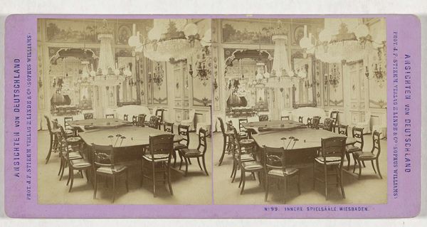 Editor: This stereoscopic print, "Casino of de speelzaal van het kuurhotel, Wiesbaden," probably created between 1868 and 1890 by Philipp Remelé, gives an oddly intimate view into what seems like an empty casino. All that fine woodworking on the chairs and tables makes me wonder... What can you tell me about how the physical realities of creating this scene might shape our understanding of it? Curator: That’s an excellent entry point. Consider the labor involved. Photographing the Wiesbaden casino during this period involved a team: from those mining materials for photographic plates, to crafting furniture and constructing the space, each contributing to the casino's performative allure. Editor: So it's not just about the artist? Curator: Precisely. Look at the chairs – the product of joiners and upholsterers. Were these objects commissioned specifically for the space, embodying wealth and social status that the Casino wished to project, or simply selected by its patrons? Who benefited most from this spectacle of labour? And the chandeliers, were these locally produced, indicating robust regional industry, or were these imports, symbolizing international ties? Editor: I see, it brings in a different perspective to think about the sources. Thinking about who all labored here really brings this once lively space back to life! Curator: Yes! By considering the process, from photographic plate to printed card, from carpenter's workshop to grand chandelier, we understand this image as a material record of an entire system of production and consumption, making visible the unseen labour underwriting the leisure depicted. Editor: This approach really makes me consider what usually remains unsaid about the social context in addition to just what I can plainly see in the photograph itself! Thank you!