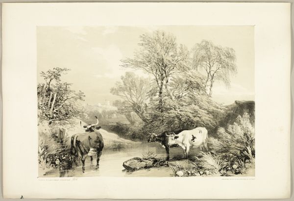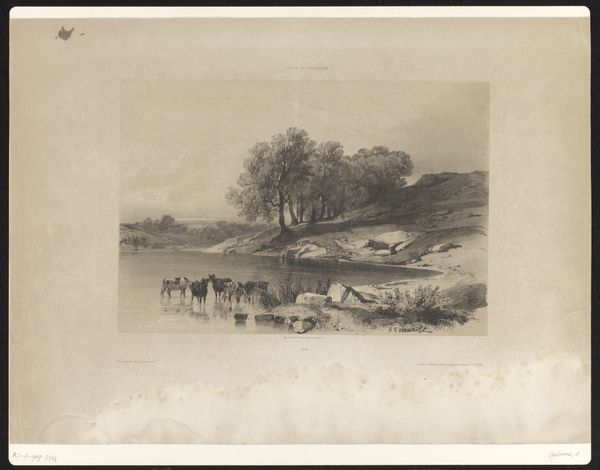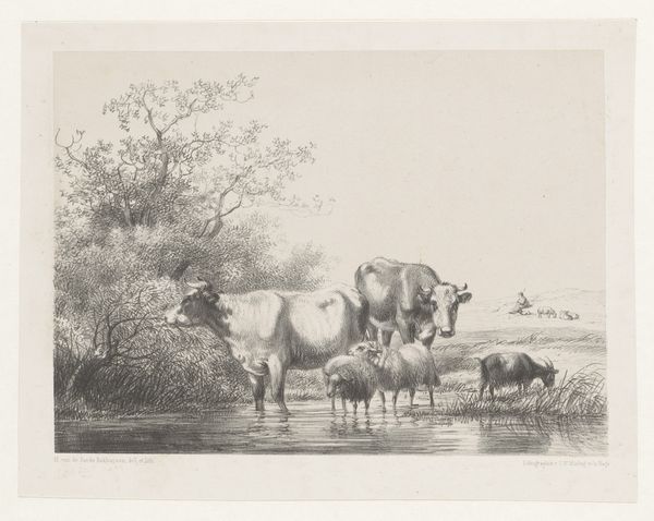 Editor: This is "Cows and a Sheep by a Hut" by Pieter de Goeje, made sometime between 1809 and 1859, using etching and other drawing techniques on paper. It feels very peaceful and domestic; almost like a snapshot of rural life. What cultural weight do you think this kind of imagery holds? Curator: It speaks to the enduring human connection with the land. Notice how the animals are arranged - almost as characters in a tableau. The humble dwelling suggests a self-sufficient, perhaps even idealized existence, invoking a pre-industrial world. Do you think this "snapshot" aesthetic is deliberate, or a product of its time? Editor: I hadn’t considered it as carefully constructed. I guess I assumed it was simply representational. Curator: Realism is never quite so simple. Even the choice of what to depict - these placid animals, the laborer tending to them – communicates values. Think of the symbolic association of cattle with prosperity and tranquility, recurring motifs in art across many cultures. What emotions are stirred in you by the hut itself? Editor: It feels quite basic, evoking the idea of essential human needs, maybe simplicity or self-reliance like you mentioned. Curator: Exactly. It's interesting how De Goeje utilizes these visual symbols, weaving together threads of human endeavor, animal husbandry, and our ongoing need for shelter and sustenance. Does your interpretation of it change with these observations? Editor: It does! I’m now appreciating how much more layered the image actually is. Curator: Indeed, exploring the imagery offers fresh perspectives. Editor: I’ll never look at a cow the same way again. Thank you.