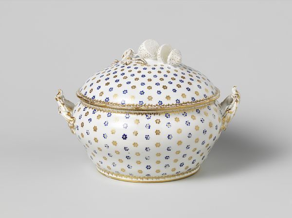 This covered vegetable dish was made by the Union Porcelain Works in Brooklyn, New York, sometime between 1863 and 1922. The whiteness of the porcelain, together with the gilded lattice-work and classically inspired motifs in green and gold, evoke the refined tastes of elite society at the turn of the century. The Union Porcelain Works was one of several American companies that attempted to compete with European manufacturers by producing high-quality, artistic porcelain. It was a time when the decorative arts were increasingly seen as a signifier of social status and cultural refinement. Museums and world's fairs encouraged an appreciation for the aesthetic qualities of manufactured objects, and thus fueled an appetite for elaborate ceramics and other luxury goods. To truly understand this object, we might look at the company’s records, as well as the exhibition catalogues and social commentaries that reveal how porcelain tableware operated in the cultural life of the period.