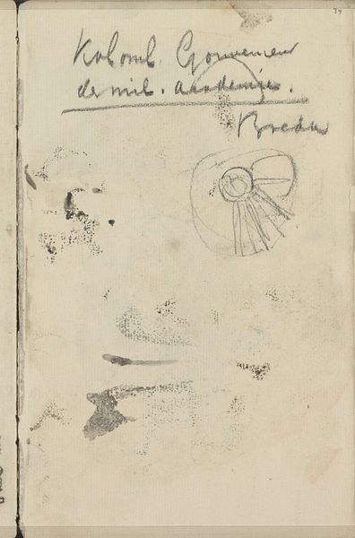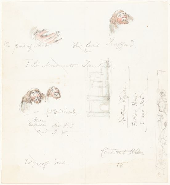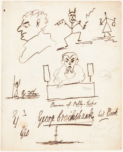 Curator: This drawing, "Udkast til segl for Røros bjergkorps, tillige med et par små figurudkast," by Nicolai Abildgaard, likely executed between 1743 and 1809, presents itself as a preliminary study in ink on paper. I find it interesting how the lines dance between precision and suggestion, creating a dynamic tension within the composition. What are your initial thoughts? Editor: Well, the composition feels very formal, especially with those geometric shapes at the bottom. But then there's that screaming face at the top! It looks almost like a theatrical mask. What do you see in this piece? Curator: Focusing on the formal aspects, one immediately observes the division of space. The upper register is dominated by the expressive head, a burst of organic form amidst the linear geometry below. The drawing compels the viewer to reconcile these disparate elements. How do these contrasting visual languages contribute to the work as a whole? Editor: I suppose the contrast makes the screaming face stand out more. Almost as if the precision of the architecture or seal design is being disrupted. Curator: Precisely. It is an opposition of formal control versus emotive expression. Abildgaard strategically employs line weight and density to direct the viewer’s gaze and articulate the spatial relationships within the drawing. Note how the stark lines define the geometric figures in contrast to the more organic lines shaping the screaming head. The semiotic implications of such formal juxtapositions demand attention. What meaning is produced through these elements? Editor: It is compelling that simple lines communicate the idea that one set of thoughts may interrupt another's. Curator: It provides a compelling example of how formal elements can convey deeper, interpretive meanings through line and shape alone.