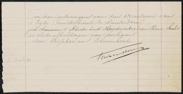 This is a receipt made in Amsterdam on October 22nd, 1885, by Frans Buffa and Sons. It acknowledges a payment of two hundred guilders from Petrus Johannes Arendzen for a 'portrait after Rembrandt'. The receipt is a fascinating glimpse into the art market of the late 19th century, and the institutions that shaped it. Buffa and Sons were a well-known firm of art dealers, who played a significant role in promoting Dutch art, both at home and abroad. The mention of a 'portrait after Rembrandt' raises interesting questions about authenticity, copying, and the market for Old Masters at this time. What did it mean to commission or purchase a work 'after' a famous artist? Was it seen as a homage, a skillful imitation, or simply a way to own a piece that evoked the style and prestige of the original? Perhaps further research into the archives of Buffa and Sons, along with period sales records and exhibition catalogues, could shed light on these questions.