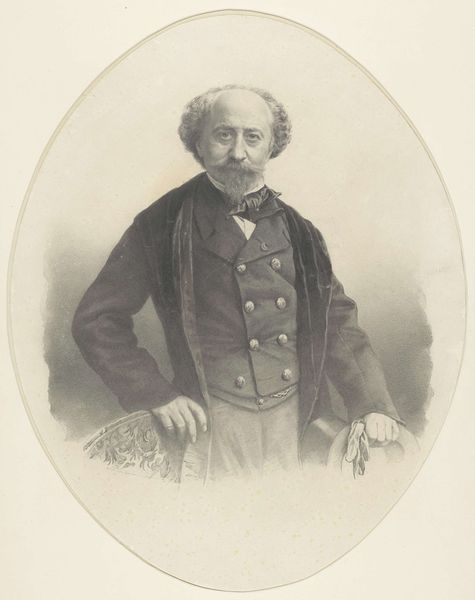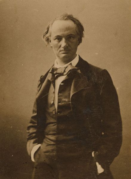 Curator: Here we see Félix Nadar's portrait of Charles Baudelaire, created in 1862. This daguerreotype offers a fascinating glimpse into the life of the celebrated French poet. Editor: My initial impression is one of quiet intensity. The oval framing seems to isolate him, focusing attention on his somewhat weary, but piercing gaze. It’s a stark presentation. Curator: It's interesting to consider this portrait within the burgeoning culture of celebrity and the democratizing power of photography in mid-19th century Paris. Nadar was at the epicenter of this, photographing many prominent figures. Editor: And Baudelaire himself had a very complex relationship with modernity, didn't he? Torn between embracing the new and critiquing its alienating effects, something you really sense when observing him. I mean, he seems simultaneously present and detached here. Curator: Precisely. Nadar’s studio was a gathering place for intellectuals and artists. His portraits played a pivotal role in shaping public perception. Look at the subtle way he has been styled: he looks every bit the sophisticated man of letters. The clothing and expression align perfectly to signal to the viewer this subject's intellectual gravitas. Editor: But, as photography developed into its early art form, one needs to think about how men dominated this new art field; it certainly lacked diversity, if we consider modern understandings. We may not think of it in Baudelaire’s historical context, but a question lingers in the background about who got to create and own imagery at the time. This photograph becomes yet another component to broader narratives of power, influence, and class. Curator: Indeed. Nadar’s work and the art world he cultivated existed within a specific social and political landscape. And to view such pictures is also to interrogate what this says of us, still looking today. Editor: It makes one wonder what Baudelaire himself would have thought of our deconstruction of his image all these years later. Food for thought. Curator: Agreed. The intersections are endlessly revealing. Thank you. Editor: My pleasure.