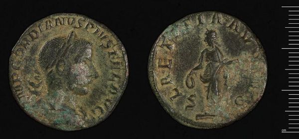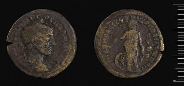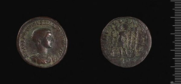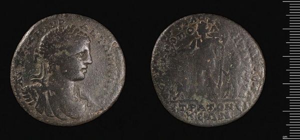 Editor: So, this is a Follis of Galerius Caesar, from Alexandria. Looking at its condition, you really get a sense of how it circulated as an object of exchange. What can you tell me about this coin? Curator: The wear and tear are key. Each scratch, each imperfection, represents a moment of human interaction. It’s not just currency; it's a record of labor, trade routes, and the material realities of the Roman Empire. What was its material composition? Editor: It’s made of bronze. Curator: Precisely. Bronze wasn't just a neutral material; it was tied to specific mining locations, trade networks, and metallurgical processes. The coin's value wasn't solely symbolic, it was rooted in the labor and resources required to produce it. Editor: That’s fascinating; I never considered the connection to labor like that before! Curator: By studying these production aspects, we challenge our ideas of what constitutes "art" and “craft”.