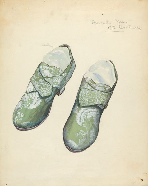 Editor: Here we have "Shoe," an anonymous watercolor and drawing, dating roughly from 1935 to 1942. It’s interesting how the artist focuses on texture, particularly on the shoe’s brocade pattern. What visual elements stand out to you? Curator: The relationship between form and decoration is quite intriguing. Notice how the artist renders the shoe's shape with clear, delineated lines, giving it a certain structural integrity. This contrasts beautifully with the fluid, almost amorphous quality of the watercolor used to depict the brocade. Editor: I see what you mean. The heel also looks less organic, more architecturally designed. Curator: Precisely! Consider the function of line here: it not only defines the object but also separates the planes of color, thereby creating a sense of depth and volume, however subtly. How might we interpret the contrast between this rather geometric heel shape and the flowery textile design covering the vamp and quarter? Editor: Perhaps it’s a playful tension, highlighting both elegance and practicality. It's almost like a study in contrasts; a controlled silhouette decorated with almost riotous botanical motif. Curator: An astute observation. The work reveals a tension inherent in the decorative arts: that of harmonizing structural elements with ornamental flourishes. Do you find the overall composition balanced? Editor: I think so, but it makes me wonder, could the image benefit from more dramatic shadowing to enhance the contrast between materials and further develop the volumetric rendering? Curator: That’s a valuable consideration. One could argue, however, that starker shading would diminish the subtle, almost ethereal quality conferred by the watercolor medium. Perhaps this emphasis is exactly what the artist wished to underscore. Editor: It’s fascinating to analyze such a simple object and discover such layered choices. Curator: Indeed. It’s often in these details where the essence of artistic intention resides.