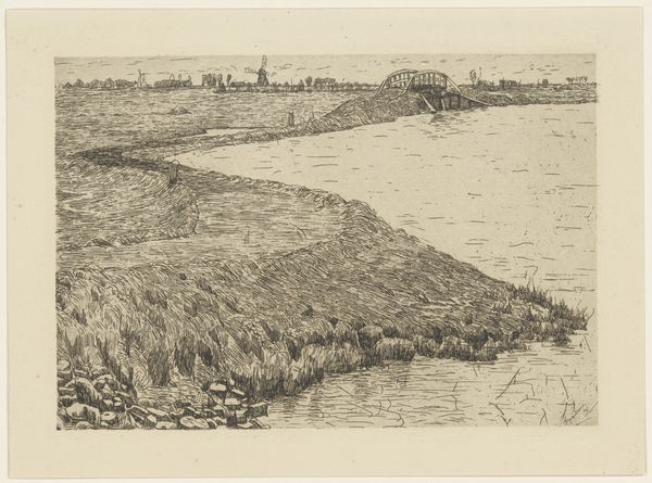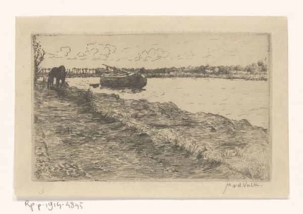 Editor: So, this is "River View with Rowboat and Sailboat," a drawing by Willem Bastiaan Tholen, made sometime between 1870 and 1931. It's really quite subtle—mostly pencil and ink on paper, I believe. I'm struck by how quiet it feels. It makes me wonder about the lives of the people who lived by this river. What do you see in this piece? Curator: I see a visual representation of the relationship between landscape and power, particularly through the lens of the late 19th century. Consider the industrial changes happening at that time. Rivers were becoming crucial arteries for trade and industry, impacting the lives of those who lived alongside them. What social structures were dependent on, or disrupted by, these changes, do you think? Editor: I suppose the fishing and maybe transport industries were affected? So you're saying the quietness I perceive might mask underlying tensions? Curator: Precisely! The church steeple in the distance might represent a declining traditional authority, juxtaposed with the rising influence of trade symbolized by the sailboats. Note how the riverbank itself seems to be crumbling or eroded. How does this physical degradation relate to social shifts of the time? Editor: Hmm, like the old social order is also eroding? That's not something I would have picked up on initially. I was too focused on the tranquil scene. Curator: These serene landscapes were often deliberately constructed to conceal complex social realities. Consider, too, who had access to these leisurely scenes. The working class experience of the river would have been markedly different. The drawing prompts us to question whose perspectives are privileged in landscape art. What happens if we center those othered, often silenced, voices? Editor: I hadn't thought of that before – about who is *missing* from the scene. It definitely gives me a new way to approach landscape art in general. Curator: It allows us to consider not just what is depicted, but what isn’t, and the reasons why. This interplay, I find, is where the real conversation begins.