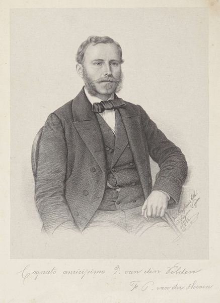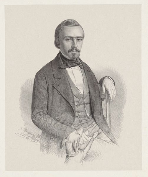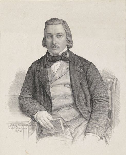 Editor: So, here we have Johann Peter Berghaus's graphite portrait of Johannes Henricus Scholten, possibly from the late 1860s. It's really quite detailed; the rendering gives such a tactile feel to the fabrics and textures. How do you approach a piece like this from a critical perspective? Curator: Examining the drawing's intrinsic elements reveals Berghaus's mastery of tonal modulation. The gradations achieved with graphite—consider the smooth skin juxtaposed with the textured jacket—establish a dynamic visual rhythm. Note how line is deployed, varying between the sharpness defining the sitter’s features and the soft hatching suggesting shadow. Editor: I see that, especially the contrast between the face and the coat, it really makes him pop. Do you think there's a reason Berghaus chose such a limited color palette? Curator: "Color palette" perhaps presupposes the presence of color. This is a drawing, an exploration of form through value. Restricting the work to graphite encourages closer attention to the relationship between light and shadow and how it defines spatial volume. It is the artist showing virtuosity of a medium through its capacity to imitate three dimensions on a two-dimensional surface. What do you make of the overall composition? Editor: I think it's really formal but in an accessible way. It seems that Berghaus emphasizes the sitter’s face, leading the eye through a carefully constructed path across the figure. That approach feels really precise. Curator: Indeed. This precision, born of close observation and controlled execution, aligns with Academic artistic principles prevalent in that period. Reflect on the lines; what semiotic meanings do they suggest when viewed through the lens of Academic formalism? Editor: Seeing it that way, the rigidness communicates the social position of the sitter. It has taught me how formal elements contribute so much to the overall impact. Curator: Exactly. By scrutinizing these technical and structural components, we glean significant insights beyond simple representation.