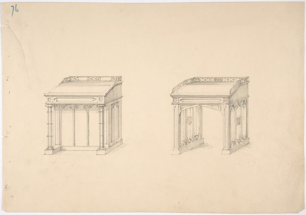 Curator: The restrained elegance here is quite striking. Editor: Indeed. It’s the simplicity. The subtle gray pencil lines. The entire composition gives me the feeling of cool, intellectual contemplation, almost like architectural stoicism. Curator: What we are seeing here is a work entitled "Design for Two Marble-topped Pier Tables," created sometime between 1800 and 1850 by an anonymous artist. It’s currently part of the collection at the Metropolitan Museum of Art. As you mentioned, it's executed primarily in pencil. Consider the historical context of Neoclassicism and how furniture design served to reinforce the status of the aristocracy by appropriating stylistic conventions from classical Greece and Rome. Editor: Absolutely. I'm struck by the table's symbolism. The marble tops themselves evoke eternity, their cool, hard surfaces representing the enduring values this class wanted to project. The sinuous curves and floral patterns carved into the supporting elements speak to luxury and status, but notice the symmetry and repetition, almost a cult of form. How was such overt visual messaging received or subverted, especially by subjugated or marginalized classes at the time? Curator: It's likely, if we analyze popular material culture that the very presence of marble tables would have immediately signaled inaccessibility. Luxury became both an aspirational symbol, and, perhaps inevitably, a site of ideological struggle. Do such loaded visual vocabularies function similarly today? Editor: Absolutely, consider how luxury brands telegraph exclusivity through specific logos, designs and associations. Here the neoclassical architectural forms echo power but perhaps with some added moral underpinning for good taste. Those associations carry through even now. Even the restrained color pallette, speaking of quiet discretion. Curator: Thank you for lending insight to these details. I hope visitors now consider how social power intersects with notions of aesthetics, how such visual signs continue to inform our perceptions of material wealth. Editor: And perhaps reflect on how everyday objects quietly transmit meaning across centuries, shaping our values and memories even now.