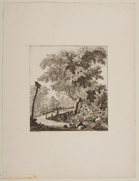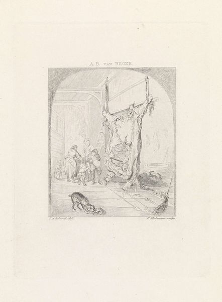 Curator: This is George Cruikshank's "Jordina and Jorindel," housed right here at the Harvard Art Museums. It's an etching. Editor: It has the feel of a shadowy dream, doesn’t it? So much contrast, all crammed into this ornate archway. Curator: Consider the etching process itself. Cruikshank employed acid to bite into the metal plate, allowing for a great number of impressions, thus making the artwork available to the masses. Editor: And what a scene: a chase, a witch, a brave figure with a pointy hat...it's like a snippet of a half-remembered bedtime story, all cages and gothic architecture. Curator: The high gothic style interior would have been seen as out of date by the time the work was produced, yet it evokes a fantasy realm within reach of its intended consumers. Editor: So much drama and detail from just a plate, acid, and ink—it truly captures the magic and fear of fairy tales. Curator: Yes, and it speaks to the democratization of art through printmaking at that moment. Editor: A fascinating intersection of craft, story, and social reach.