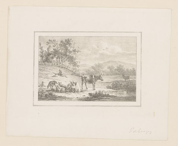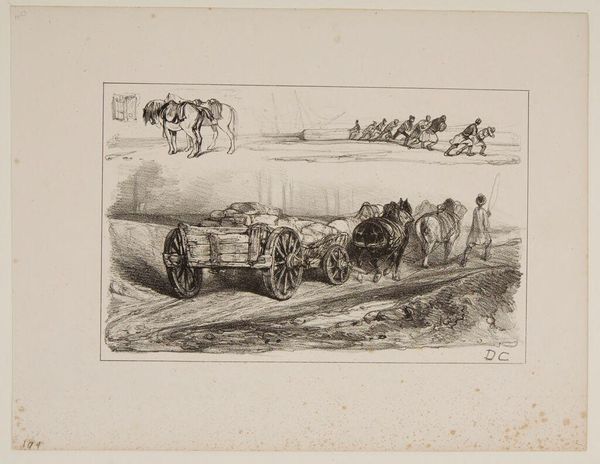 Curator: François Jules Collignon's "Crossing a Ford," transports us to a bygone era. The etching technique captures incredible detail. Editor: It's like stepping into a dream! There's something about the light, so delicate, that makes it feel almost ethereal. Curator: Notice how the covered wagon becomes a symbol of journey, transformation, perhaps even escape? The ford itself is a liminal space. Editor: Absolutely! I wonder what stories those horses could tell. They look so weary, yet they persevere, like life itself, eh? Curator: Indeed, a poignant observation. We see enduring themes of human resilience and the lure of the unknown, etched in ink and time. Editor: Well said! And somehow, seeing this, I feel a strange connection to those travelers, sharing in their timeless journey.