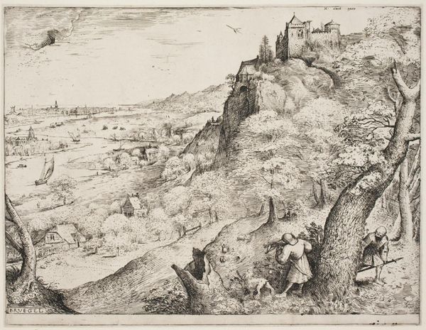 Pieter Bruegel the Elder created "The Hare Hunt" as an etching measuring 20 by 30 centimeters. The density of fine lines is immediately striking, drawing us into a world teeming with activity and detail. The composition divides into three distinct horizontal bands. In the foreground, hunters and their dogs engage in their pursuit amidst the intricate foliage. The middle ground reveals a sweeping landscape, dotted with buildings and fields, while the distant background fades into a serene expanse of water and sky. The use of line to delineate every element creates a rich textural surface, characteristic of the artist's style. Bruegel’s structural approach, rooted in Renaissance landscape painting, is married with elements of Northern realism to explore the interrelationship between man and nature. The artwork’s symbolic weight is revealed as it encapsulates the artist's awareness of human activity set against nature’s broader, indifferent backdrop. The hunt, as depicted, transcends its literal meaning to suggest a meditation on human endeavours within the vast theatre of the world. The hare hunt captures the essence of a fleeting moment, inviting sustained observation.