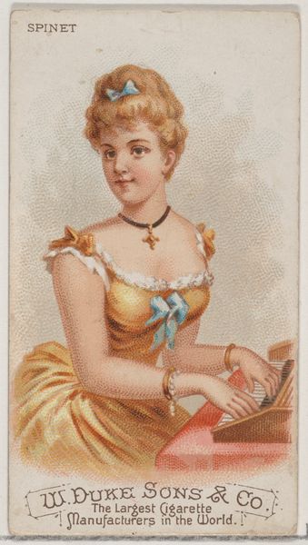 This small card portraying Annie Robe comes from a series of actresses and society women printed in the United States around 1888, by Allen and Ginter Cigarettes. These cards were included in cigarette packs as a marketing strategy, reflecting both the burgeoning advertising industry and the widespread social changes of the late 19th century. The rise of consumer culture and mass media created new opportunities for businesses to promote their products, often by associating them with desirable images, such as these 'World's Beauties'. The carefully chosen image and idealized representation of women reinforces prevailing beauty standards and social expectations, even as women were beginning to agitate for greater social and political freedoms. What can this piece tell us about consumer culture and the commodification of beauty at the time? Only through careful research into the popular media and social trends of the time can we understand the significance of this seemingly innocuous image.