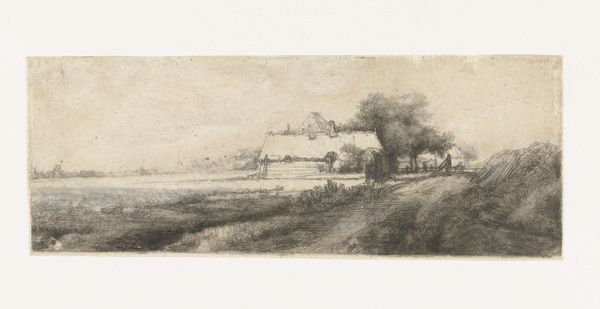 Editor: So, this is "Sletten ved Selon i Berri?" by Theodore Rousseau, made sometime between 1842 and 1847, using charcoal and pencil. I’m immediately drawn to the way the textures are built up—it feels almost tactile despite being a drawing. What stands out to you? Curator: I'm interested in how Rousseau’s use of charcoal and pencil elevates the humble landscape genre. He’s not just depicting a place; he's also foregrounding the *process* of depicting. Notice how the varied pressures on the charcoal create depth and volume; the materials become actors in constructing the scene. What was the Berri region like at the time and who was working that land? Editor: I'm not too familiar with Berri back then. Were there specific agricultural practices or industries prevalent in Berri at that time that might have influenced the choice of subject matter? Curator: Exactly! We need to understand the means of production. The land, the crops, the labor, and how it was used. This wasn't untouched wilderness, it was actively farmed. Rousseau chooses not to glamorize that reality but observes it closely. Are we meant to consider how those textures might mimic fields of cultivated crops and suggest the manual labour required in agriculture? The very marks made upon the page serve as a form of production reflecting human impact. Editor: That’s fascinating. I hadn't thought about it in terms of production, both in the landscape itself and in the art-making. So it isn't just a pretty picture; it shows a cultural and economic dynamic? Curator: Precisely. And think about the *availability* of these materials - charcoal, pencil and paper- cheap media in the hands of an artist dedicated to observation over idealisation. Also the scale, perfect for moving across land and creating multiple images to understand an area of interest. How do these more quotidian and cheap resources play against earlier expectations of wealth and value that relate to fine art materials? Editor: So it's about finding value in what's readily available? That perspective has given me a completely new appreciation for the work. Curator: Indeed, understanding the "stuff" helps decode the subject, the meaning, and the method, of art history.