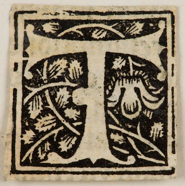 Curator: This is "Initial P," created by an anonymous artist. What strikes you first? Editor: The bold contrast! Black ink forming an ornate letter "P," set against what looks like handmade paper. It feels medieval, a fragment of some larger, illuminated work. Curator: Exactly. Consider the labor invested in creating such detail. The block printing process meant carving away negative space, revealing the design in relief. Each print requires careful hand-application. Editor: The floral motifs inside the "P" give it a sense of organic growth, contrasting nicely with the geometric rigidity of the letterform itself. The unknown artist clearly understood compositional balance. Curator: And what was the social purpose of this production? Was it for religious text, secular documents, or something else? Thinking about where it sits in the hierarchy of art is important. Editor: Yes, contextualizing this piece, it's beautiful how the form and function unite in such a seemingly simple yet powerful design. Curator: Indeed, there's a tactile quality that's lost in our digital age.