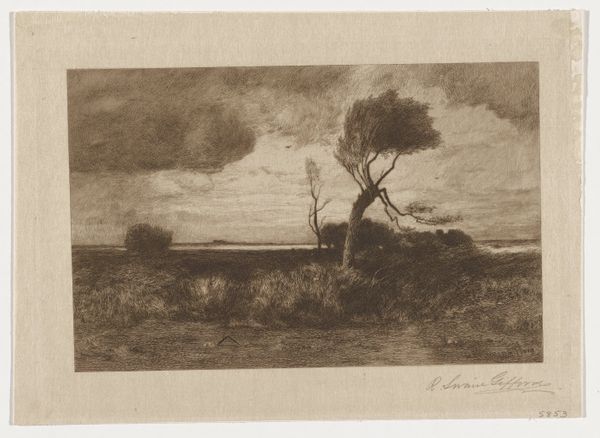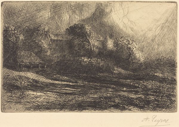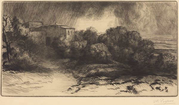 Editor: Here we have Etha Fles's "Huizen onder een zware lucht," or "Houses Under a Heavy Sky," an etching created sometime between 1867 and 1910. The somber scene and desolate landscape evoke a feeling of isolation. What do you see in this print? Curator: It’s compelling how Fles uses the landscape not just as scenery, but as a mirror to reflect the social and emotional climate of her time. Considering this work falls within a period of significant social change and growing industrialization, doesn't the oppressive sky and the huddled buildings speak to the anxieties and uncertainties many felt then? Editor: I hadn't thought about it that way. The "heavy sky" feels personal, but you're right, it could represent a much larger feeling of unease. Do you think Fles was making a deliberate political statement? Curator: It's hard to say definitively, but artists like Fles were acutely aware of the societal shifts occurring around them. The choice of a desolate landscape, rendered in such a stark and unforgiving manner, invites us to consider what is being lost or threatened by these changes. How might this image resonate with contemporary concerns about environmental degradation or the displacement of communities? Editor: That’s a powerful connection. The solitary tree, almost skeletal, becomes a symbol of resilience, or perhaps loss. What do you make of its prominent placement? Curator: The lone tree serves as a powerful visual metaphor. Stripped bare, it represents vulnerability and the enduring strength needed to weather difficult times. It reminds us of the vital connection between the land, the people, and the social fabric they create. Considering feminist interpretations of landscape, what stories do you think Fles, as a woman artist, might be telling through this work about women's relationship to space and place? Editor: That's a new perspective for me to consider! I guess I was focused on the overall gloom, but framing it through these lenses really opens up the potential meanings. Curator: Exactly. Art provides this crucial meeting point. I hadn't considered the artist's perspective so clearly until this dialogue. Editor: And I'm now understanding how art reflects society! Thank you.
