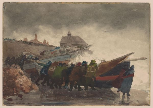 Editor: This is "Fifth Avenue Bus, 23rd Street and Broadway," a drawing by Everett Shinn created around 1914, utilizing charcoal, pencil, and pastel. It really captures the feeling of a blustery day in the city; the colors and indistinct shapes definitely give off an impressionistic vibe. What catches your eye about this piece? Curator: Immediately, the interplay of light and shadow demands attention. Shinn masterfully utilizes chiaroscuro to create depth, transforming the two-dimensional surface into a seemingly tangible, bustling city street. Observe how the artist structures the composition; the dark mass of the bus provides a strong anchor, contrasted against the lighter, gestural strokes depicting the figures. What compositional techniques can you identify? Editor: The way he uses strokes really does convey movement. The light reflecting off what seems like a wet street, the blurry figures huddled against the wind... the dynamism is incredible. It’s all created with such simple materials, right? Curator: Precisely. Shinn's strategic application of charcoal and pastel allows for a nuanced portrayal of texture. The grainy quality evokes a palpable sense of atmosphere. Consider the use of line, as well: the long, sweeping lines define the direction of the wind, whilst shorter, more broken lines illustrate the fleeting presence of pedestrians. How would you categorize the surface quality and its effects on the work's meaning? Editor: I guess, without the textures, it wouldn’t feel as immersive? The rough surface is like feeling the wind yourself. Curator: A keen observation. The artwork’s meaning isn’t just *in* the represented objects, but also arises through the material and techniques employed. Are you also seeing the impact of the city’s industrialisation, or rather the feeling of a fleeting moment that suggests the change? Editor: Yes, I see that! I initially saw a gloomy urban landscape, but I’m noticing more subtlety in the application of those techniques now. Curator: And that is how an image evolves: technique builds toward atmosphere, which together shapes the interpretation.