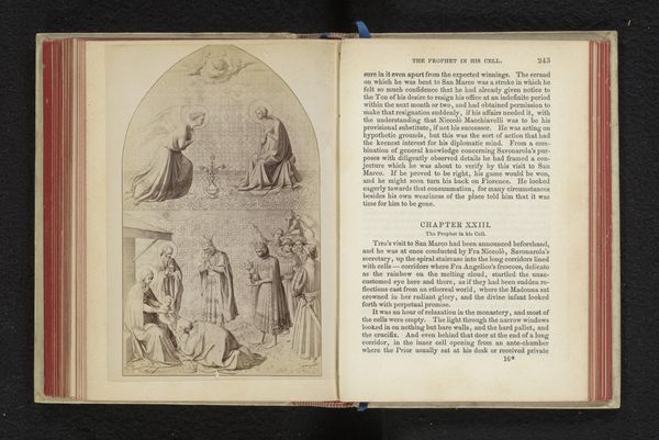 Curator: Here we have a photographic reproduction of a print, most likely an engraving or etching, of a fresco predating 1890. The work depicts the empty tomb of Mary. Editor: The scene is dominated by shades of sepia and cream; it's a study in stillness and reverence. What strikes me most is the positioning of the angel and Christ figures at opposite ends. Curator: Yes, the composition invites some interesting reading. Let's consider the original fresco itself, part of the Italian Renaissance movement. Its creator engaged with narratives reflecting the intersection of faith, power, and artistic patronage. How does the reproduction alter this understanding, by stripping the image of color and texture? Editor: Absolutely. The angel sits to the side of the sarcophagus. The angel's role is key here. Throughout the ages, angels herald significant transitions. Is this pose a way to portray Mary’s assumption to heaven? Also, notice the contrast between Christ's ethereal presence above the tomb versus the palpable weight of grief held by the apostles, the psychological depth is rather interesting. Curator: It really is fascinating how the artist frames gender within this spiritual narrative, where Mary’s absence becomes the catalyst for the disciples' mourning and subsequent encounters. This image functions as an ideological canvas of faith in the face of loss and uncertainty. Also, do we know the social class or any marginalized groups who commissioned it? Or its place within Renaissance understandings of art as social performance? Editor: The shift in rendering the narrative for modern eyes does subtly shift the focus. Instead of the ethereal colors in a fresco it has been rendered here in stark print—perhaps the meaning behind this shift in materiality and the weight of tradition behind this decision, creates even deeper cultural meaning through form. Curator: Indeed, tracing these layers and intersections allows us to grapple with a complex network of values encoded within its visual language. Editor: In essence, by exploring artistic intent and spiritual storytelling we open ourselves to a new and vibrant interpretation, creating cultural insight that helps ground historical continuity within shifting visual paradigms.