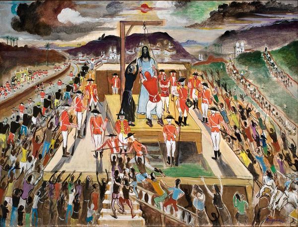 Curator: I’m immediately struck by the unsettling feeling that permeates this otherwise celebratory-looking scene. The murky palette coupled with the stylized figures gives off an almost sinister vibe. Editor: Well, let's contextualize that initial impression. This is Ralph Fasanella’s "McCarthy Era Garden Party" from 1954, rendered in oil paint. Looking closely, you see a scene filled with both lavish celebration and protesting figures, all framed within this almost surreal landscape. Curator: The surface itself appears built up, layers upon layers, giving the piece a tactile quality. The density echoes the palpable tensions of the era it depicts, the anxieties worked directly into the materials. I find that fascinating; the physical properties mirroring the subject matter. Editor: Precisely! Think about the socio-political context—the height of McCarthyism, a period marked by intense anti-communist suspicion and persecution. The demonstration right outside this high-society party explicitly politicizes themes of class, power, and oppression within postwar American life. Fasanella really captures the stark class divide and political unease roiling beneath the surface. The protesters carry signs advocating civil liberties, demanding justice against what they viewed as unjust political persecution. Curator: Notice how Fasanella contrasts the flat, almost folk-art style depiction of the masses with the elevated banquet table. The figures seated are much more detailed and refined, set against what looks like a surreal greenhouse. The formal garden—it’s literally built on top of what? A political undercurrent. That’s where I think the genius lies: turning something deceptively bucolic into a pressure cooker of dissent and conformity. Editor: And we need to look at Fasanella himself. His working-class background deeply informed his perspective. He transformed the traditional perception of artistic labor, embracing an ethos deeply entrenched in working-class resistance. His pieces use “naïve art” to explicitly challenge elites. It also prompts a deep reflection on collective memory, urging engagement with parts of history that have frequently been suppressed. Curator: Indeed. This artwork underscores art's role in not merely reflecting the political landscape but engaging actively in its reinterpretation. The manipulation of material becomes inherently critical. Editor: Absolutely. Reflecting on it now, “McCarthy Era Garden Party” is a striking visualization of social friction, inviting us to interrogate historical silences and the continuing quest for equality.
