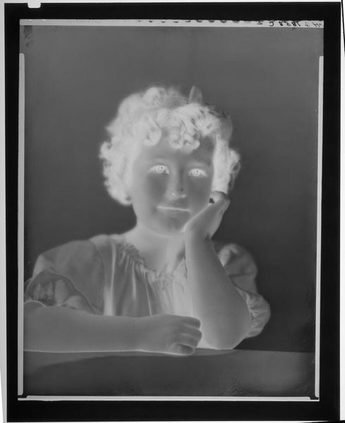 Paul Gittings' small-scale photographic negative, "Untitled (girl with hand on cheek, feather in hat)," captivates with its stark contrast and carefully arranged composition. The subject, a young girl, is centrally positioned, her form emerging from the dark backdrop in luminous detail. The composition is structured by the girl's pose, her hand gently supporting her cheek, which creates a diagonal line that bisects the frame. Consider how Gittings uses light and shadow to sculpt the girl's features, emphasizing her gaze and the delicate texture of her hat. The inversion of tones inherent in the negative format heightens the photograph's abstract qualities. This artistic choice destabilizes conventional portraiture by transforming familiar visual cues into something less literal and more structurally intriguing. The photograph challenges our perception of form and representation, asking us to look beyond the surface and engage with the underlying mechanics of seeing.