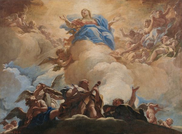 Corrado Giaquinto made this painting, "The Trinity with Souls in Purgatory," on canvas, sometime in the 1700s. Consider the smooth surface, achieved through layers of oil paint carefully applied. The canvas is almost invisible. Giaquinto has completely mastered the art of illusion, creating a vision of the divine. The almost airbrushed effect is far removed from the labor-intensive, material realities of its making. Yet, the painting is, in fact, a product of skilled labor. Think of the canvas, woven thread by thread, stretched, and primed. Consider the pigments, mined, ground, and mixed with oil. And finally, the artist himself, trained for years to achieve this level of skill. In this way, even a painting of the heavens is tied to earthly concerns of work, skill, and commerce. Recognizing the effort involved allows us to appreciate the true value of this kind of artwork. It helps us look beyond the celestial vision and toward the human endeavor that made it possible.