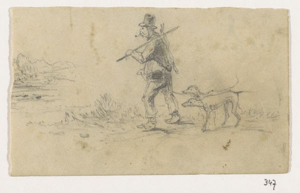 Curator: Looking at this sketch, there's a hurried yet captivating energy. The composition, though loose, immediately evokes a sense of pastoral unease, wouldn't you agree? Editor: I see the unease, certainly, but I wonder if it stems less from inherent qualities and more from our understanding of Cromwell himself. Ford Madox Brown created this study for a painting titled ‘Cromwell on his Farm’. Curator: And how fascinating that Brown, a 19th-century artist, grapples with such a divisive figure. Is he humanizing him, showing Cromwell outside the battlefield, in contrast to the era’s narratives about power? Editor: It challenges the heroic narratives, indeed, but perhaps also reinforces a certain patriarchal structure by placing him on his land, in control. We must consider the politics of representing historical figures in relation to Victorian social norms. Curator: Absolutely. Considering the social context is vital. For me, it brings forth questions about land ownership, power, and historical representation itself. Editor: This sketch prompts a look into art's capacity to shape historical memory and reinforce ideology. A potent reminder of how art and history are always in conversation.