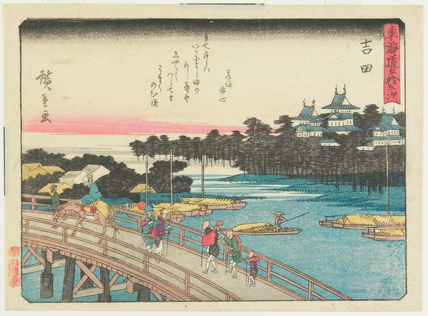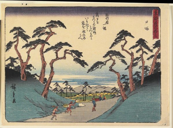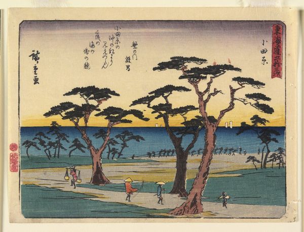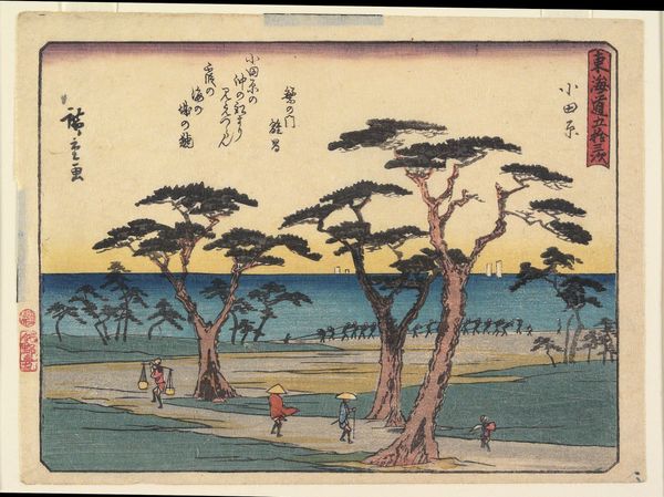 Utagawa Hiroshige's woodblock print, "Shirasuka - View of Shiomizaka," presents a serene coastal scene using subtle colors and carefully arranged forms. Notice how the composition balances the diagonal sweep of the path with the horizontal expanse of the sea. This creates a sense of depth and invites the eye to wander. The trees, rendered with dark, textured foliage, frame the view and lead us towards the distant horizon. The figures are small, yet their placement enlivens the scene, adding a narrative element. Hiroshige masterfully uses the woodblock medium to create a sense of atmosphere. This print is not just a depiction of a place; it’s an exploration of spatial relations and perspective. The arrangement of elements reflects the artist's engagement with how we perceive and experience space, transforming a simple landscape into a carefully constructed visual experience. The composition, therefore, invites us to reflect on how we ourselves navigate and find our place within the broader landscape.