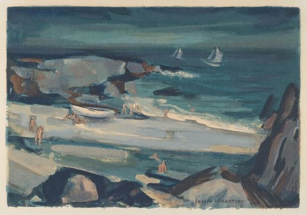 Samuel Peploe's "A Rocky Shore, Iona" is a landscape that arrests us with its dynamic tension between solidity and fluidity. The rocks in the foreground are rendered in robust, angular strokes of blues, whites, and browns, creating a tactile sense of weight and permanence. This contrasts sharply with the energetic sea, where the artist uses quick, broken brushstrokes to capture the movement of water and light. This opposition isn't just descriptive; it seems to destabilize our assumptions about the natural world. Peploe's modernist approach is evident in how the landscape is reduced to its essential forms and colors, pushing beyond mere representation to explore the visual language of painting itself. The formal qualities of the work – the interplay of mass and void, the contrast of textures – invite us to question the stability of appearances and the nature of our perception. In this way, Peploe prompts us to engage with a vision that remains vibrantly unsettled.