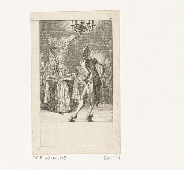 Editor: Here we have Daniel Chodowiecki's "Begroeting bij binnenkomst" from 1778, a print made with etching and engraving. There's a formality to the scene, a sense of social ritual. What do you see in it? Curator: I see an eloquent illustration of material constraints and social performance. Chodowiecki, through the reproducible medium of etching, democratized access to imagery, impacting social behaviours and understandings of class. This wasn't a unique canvas owned by a wealthy patron; it was a readily available print. Consider how the very act of bowing, meticulously rendered, highlights a culture steeped in prescribed gestures—performance as labour. Editor: So the print medium itself allowed the distribution of social ideas? Curator: Precisely. Think about the paper it's printed on – likely mass-produced. The labour involved in making and distributing prints like these facilitated the spread of ideas about manners and societal norms amongst a broader public than painting could ever reach. How did that expanded audience reshape class structures in that moment? What commodities underpinned this change in societal norms and material conditions? Editor: That’s a completely different way of looking at it! I hadn't considered the material production impacting social constructs so directly. Curator: Art is a product of its time, made using the materials available, for a specific purpose, reflecting social dynamics. Examining the materiality helps to demystify traditional notions of art as something solely aesthetic. Editor: I now see how considering the material components gives you a window into production processes and the socio-economic conditions, broadening my understanding of the artwork's purpose within a society. Thanks for sharing your insights. Curator: It's been insightful seeing how those layers can illuminate each other!