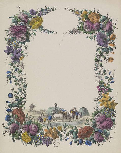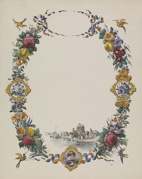 Editor: So, this is "Wensbrief met bloemenkrans en landschap met boerderij en dieren," made sometime between 1829 and 1880 by firma Joseph Scholz. It's a watercolor painting. The combination of the detailed floral border with a quaint countryside scene makes it feel like a heartfelt greeting. What stands out to you about its place in history? Curator: What intrigues me is the context of its creation. It’s firmly within the Romanticism movement, which idealized nature and emphasized emotion. Consider how this “wensbrief,” or wish letter, functioned socially. Before widespread postal services and mass-produced cards, such personalized artworks were precious commodities. Editor: A precious commodity indeed! I hadn't considered how rare something like this would have been. Curator: Precisely. Now, think about who would be commissioning and receiving such a letter. These personalized pieces likely circulated within a particular social class, reinforcing connections through shared values and aesthetic preferences. Does that change your view of it? Editor: Definitely! Knowing it was a way for a certain social group to connect adds another layer to understanding its intent. It's not just about the personal message, but also about belonging. I initially focused on the beautiful details but now it also makes me wonder about the networks in which this object circulated. Curator: Exactly. And consider the idealized landscape. It presents a vision of rural life that’s likely more picturesque than realistic. The “boerderij,” or farm, is harmonious. Editor: Now that you mention it, it almost feels like a stage set, idyllic. It does highlight the tension between nature and society inherent in the era’s imagery. Thanks, I see it now.