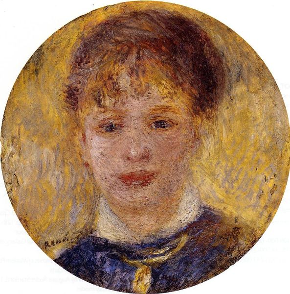 Editor: So, here we have Renoir's "Woman with a white jabot," painted around 1880 using oil on canvas. She looks very proper, but I’m wondering about that single flower. What can you tell me? Curator: It’s fascinating how that flower interrupts the severity, isn't it? Think of the "jabot" itself. These lace collars began as functional, but evolved into symbols of status and refinement. They visually speak to the sitter's belonging to a certain class. Editor: Right, but the flower feels so… deliberate, almost like a code. Curator: Precisely! A flower in portraiture often holds layered meaning. This isn’t just decoration. Roses are of course common emblems of love and beauty. And a white or pale pink rose frequently signals innocence and purity, perhaps alluding to virtue, especially when paired with the otherwise rather rigid elements of her clothing. What emotions does her expression convey to you? Editor: Hmm, I see your point. Her expression does have an emotional coolness to it. It seems to be playing with two registers at once – vulnerability and detachment. The lace and flower point to delicacy but also feel rather performative. Curator: That duality you pinpoint is very much at play. And if we delve deeper, flowers carry cultural memories too. The floral element might be a contemporary Victorian motif, subtly asserting feminine ideals, and reflecting them back on to this particular woman. Editor: I see. So even what seems simple, like a flower, speaks to broader social ideas… It almost encourages you to unpack what you think you know about the woman in the portrait. Curator: Indeed! It’s the quiet visual dialogue, full of symbolism, which makes the work so captivating. Editor: Thanks, that was really helpful. I didn't realize how much information was packed into what looked like just a pretty picture.