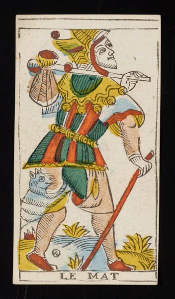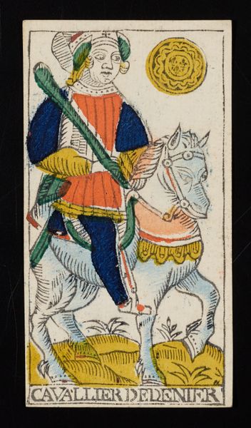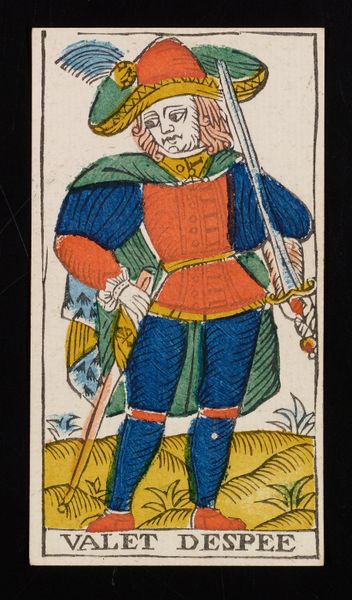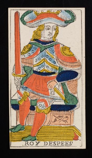 Editor: Here we have "King of Batons," a print from 1751 by Claude Burdel, housed here at the Minneapolis Institute of Art. It has an interesting, almost flat quality, like an image from a deck of playing cards. It's playful, but also a bit stiff. What are your thoughts about this artwork? Curator: Ah, yes, "King of Batons!" Looking at him, I can't help but imagine him as a character in some absurdist play. His oversized hat, that somewhat vacant stare, it all smacks of caricature, doesn't it? But it's rooted in something deeper. It makes you consider how power presents itself. Is it all just costume and posing with large sticks? Editor: So, you see a performative aspect to it? Like he's *acting* as king? Curator: Precisely! And considering its historical moment – 18th century Europe, on the cusp of major social upheavals – this image takes on added significance. It makes one ponder: is royalty genuinely divine or merely a performance? It reminds me of gazing into a distorted carnival mirror reflecting the world of aristocratic flamboyance, just before the music stops! Don't you get that impression? Editor: I do. Now that you point it out, there's definitely a sense of artificiality there. Almost like a commentary, however subtle. Curator: And there's something strangely appealing about that crudeness, don't you think? This pre-photographic rawness allows the King to express a different kind of story. Now tell me, what do you take away from seeing art like this, where the boundaries between high and low culture become happily blurred? Editor: It really broadens my understanding. I’m no longer looking just for the conventionally beautiful or skillful, but thinking about historical context, and even the artist’s intention in depicting this king! It's fascinating.