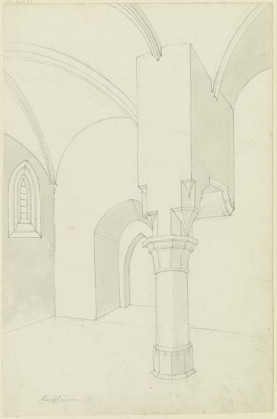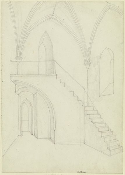 Curator: Well, I'm immediately drawn in by the sheer stillness. It’s almost unnerving in its quietude, wouldn’t you say? Editor: It's definitely hushed. We're looking at a pencil drawing titled "Kapelle mit drei Betstühlen" or "Chapel with Three Prayer Pews," rendered on paper. The artist is Karl Ballenberger, and this piece currently resides here at the Städel Museum. The architecture commands the scene with that stark perspective. Curator: That's exactly it. The architectural lines seem to pull you into the vanishing point, toward some unknown spiritual horizon. It makes the chapel feel almost like a psychological space, a chamber of the mind. The sparseness… three empty pews… What symbols do you read in it? Editor: The pews, while ostensibly about prayer and religious observance, speak more broadly to notions of absence and potential. Think about the social context of religious spaces, and the complex political role the church had in 19th century German society – or whenever this was made. Is this reverence or critique? Curator: A tension, perhaps? Those arches overhead, that ribbed vaulting...it recalls the ambition of sacred architecture. But the emptiness undercuts that ambition. Where are the faithful? Why so deserted? This chapel evokes not so much the glory of God, but perhaps a questioning, an anxious search for the divine in an age of doubt. Editor: Indeed. We should also note Ballenberger’s skilled hand, of course. Look at the subtle gradations in shading, the way he captures the play of light. Curator: Oh, without question, technically proficient and very controlled. But what interests me even more is what this lack represents: the absence of people and their traditions within a grand symbolic space. A signifier of shifts. Editor: Shifts that, for me, also relate to changing political power dynamics and cultural upheaval. Thanks for illuminating that point. Curator: It has been a pleasure interpreting this intriguing drawing with you. Editor: Agreed, thank you.