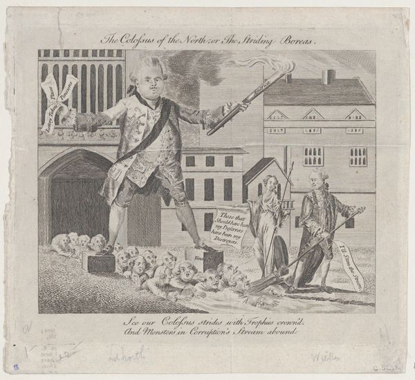 Editor: This is "The Bloody Massacre in King-Street, March 5, 1770," a print made by Paul Revere. The strong reds jump out, really highlighting the violence, while the almost cartoonish figures add an odd disconnect. What do you see in this piece beyond just the historical narrative? Curator: Precisely. Let us focus on the intrinsic qualities of this print. Notice the stark linearity that defines the architecture and the figures. The formal repetition of the redcoats and their rifles creates a sense of rigid order juxtaposed against the chaotic disarray of the fallen colonists. Editor: I hadn’t noticed that rigidity. What about the use of light and shadow? They seem quite flat, almost… symbolic. Curator: Indeed. Observe how Revere eschews traditional shading in favor of stark tonal contrasts. The limited palette directs our gaze, emphasizing the symbolic weight of the figures, especially those highlighted in the foreground. The formal flatness arguably enhances the emotional impact rather than detracting from it. Editor: I guess focusing on form rather than realism does heighten the drama. What do you make of the text integrated into the image itself? Curator: A crucial element! The text functions as both description and editorial. Formally, the lettering echoes the linearity seen elsewhere, but more importantly, it explicitly interprets the event for the viewer. The print manipulates the viewer's reaction not just through visual cues, but textual ones, all combining to create a cohesive propagandistic artwork. Editor: So, the formal choices amplify the intended meaning, rather than simply illustrating a scene? Curator: Precisely. By examining the composition, color, and line work, we uncover the deliberate construction of meaning within this seemingly straightforward historical print. It reveals how visual choices inherently embody ideological viewpoints. Editor: That’s a great insight! I’ll never look at historical prints the same way again.