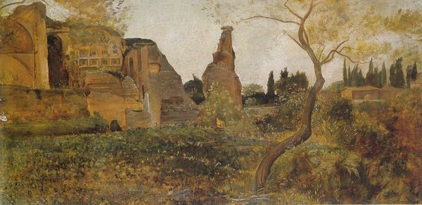 Editor: This is Theodore Rousseau's oil painting, "Church of Saint Lou d'Esserant in the Oise." It has a dreamlike quality with soft, diffused light, almost like a memory. What strikes you about the composition of this work? Curator: Indeed. Let's consider the interplay of light and form. Rousseau constructs the architecture of the church using color modulation rather than distinct lines, dissolving the solidity of the structure into a tapestry of tonal values. Notice how the brushstrokes, though visible, serve to create a unified surface, emphasizing the painting’s materiality and its autonomy as an object. What effect does that flattening have on the viewer, would you say? Editor: I see it makes the church less imposing. More a part of the overall atmosphere. It merges with its surroundings, like the trees and foliage in the foreground, softening its presence. Curator: Precisely. The spatial relationships are flattened, creating a tension between the depicted subject and the picture plane. Consider how Rousseau has handled the negative space around the towers, which shapes the composition and leads our eye to observe certain architectural relationships. Does the arch at the top modify this relationship in your estimation? Editor: It certainly creates a frame of sorts. I hadn’t considered it before, but that framing draws all the compositional elements together. It emphasizes that flattening and reminds us that it is paint on canvas, skillfully composed, as much as it is a depiction of a church. Curator: Yes, an excellent observation. Ultimately, the success of this work lies in Rousseau’s ability to manipulate the formal elements of painting to create an experience that transcends mere representation. Editor: Thank you. It's amazing how analyzing these elements helps you to perceive and appreciate art in new ways. Curator: My pleasure, there is always something new to see when we look more closely.