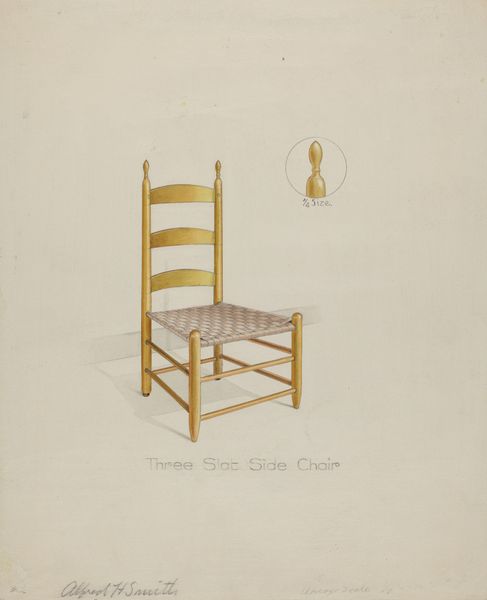 Curator: Let's talk about Randolph Atkinson's 1940 piece, "Child's Chair." It's rendered in watercolor and pencil on paper. What strikes you first? Editor: It exudes a sense of quiet solitude. The empty chair against the blank background…it speaks of absence and the lingering memory of childhood. Almost melancholic, wouldn't you agree? Curator: Perhaps. I see something simpler: a dedication to process. Notice the detail in the woven seat, rendered meticulously in watercolor. It elevates a humble, utilitarian object. I am thinking about production techniques during wartime America. Editor: Ah, but a chair is never just a chair. Consider its symbolic weight. This diminutive chair could represent vulnerability, protection, or even unrealized potential. Children often symbolize innocence, and here the object that supports the child’s form remains unoccupied. Curator: I grant you that a chair holds significance as an object encountered throughout childhood; and yet it seems pertinent to consider the practical skill in its crafting as an object meant for mass consumption, at that time. Was it locally sourced materials, the artist showing interest in an American company, versus relying on European counterparts? Editor: A fair point. The deliberate craftsmanship cannot be dismissed. The use of such traditional techniques reflects an ideal of family that endured throughout global conflict. Doesn't this modest seat present a cultural space of security during social precarity? Curator: I find that fascinating. I tend to veer away from grand interpretations. I wonder about the labor involved. About what the artist was intending to spotlight via the media used in contrast with that of manufacture? Editor: Well, viewing the object’s role as both practical item and potential emblem seems like a rich direction of investigation to be sure! Curator: It does give us a lot to ponder regarding value during the forties. Editor: Absolutely. This piece is richer than one might assume!