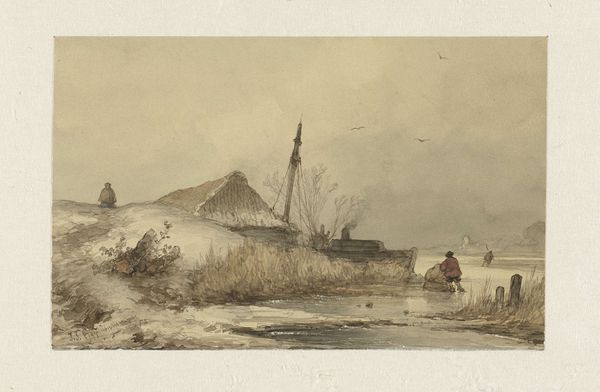 Curator: This delicate watercolor work, created by Joseph Hartogensis between 1832 and 1865, is titled "Landschap met molen," or "Landscape with Windmill." It resides here at the Rijksmuseum. Editor: It has a wistful quality. Pale tones give it a rather gentle, even melancholic air. It looks to me more like an exercise in depicting the damp Dutch climate through subtle material changes than a celebration of the industrial technology. Curator: Indeed. And those tones speak to something deeper when viewed from our contemporary understanding of climate and ecology, don’t you think? Consider this work as produced during the beginning of a time of enormous transformations of land use and production, a subtle reminder that technology always comes with a price and that these "charming" or "folkloric" machines were actually transforming ways of life forever. Editor: I see your point. It definitely shows an environment increasingly shaped by labor and the necessities of production. It makes me consider not just the mechanics of milling, but the physical work done in those marshy conditions, the crops processed, and ultimately the human need the process serves. Look closely—the artist subtly uses the layering of colors to differentiate the work on land versus the open water. It draws your attention to this dependence upon geography for daily survival. Curator: I agree. But also it prompts us to examine the lives of these people situated by water. What roles do these men perform? How does class dictate those roles? In some ways, it romanticizes those functions—lacking a critical view of working conditions or labor laws of the time. It needs additional contextualization so modern viewers might avoid idealizing inequitable systems of labor distribution or capitalist enterprise of 19th-century Netherlands. Editor: A strong argument for broadening its interpretive value to avoid glorifying harsh conditions. Perhaps some display materials about Dutch mercantilism, colonial exploitation, or histories of labor union organizing could contextualize it well. Curator: Exactly! Understanding Dutch expansion—social mobility alongside the industrial advances this windmill represents-- helps bridge it to now, allowing this delicate work to illuminate essential questions about social justice. Editor: It also really shows the quiet power inherent in quotidian, accessible art forms—I admire Hartogensis’ delicate approach with such loaded subject matter, and I think it deserves thoughtful consideration.