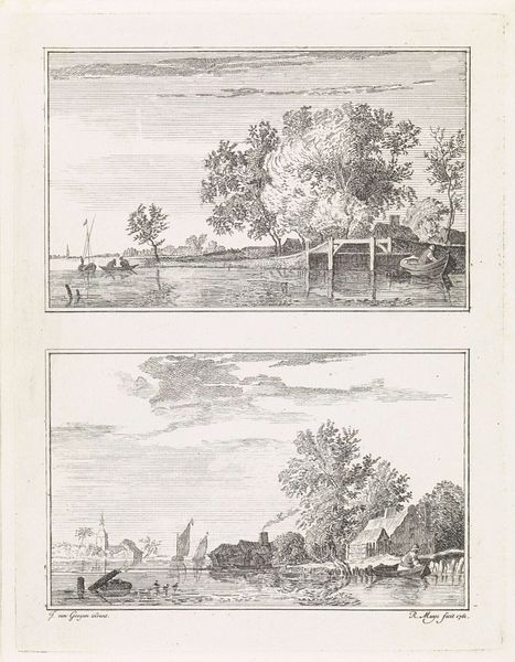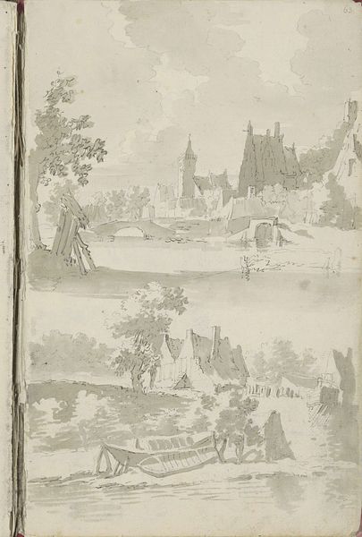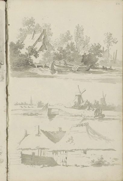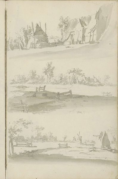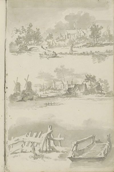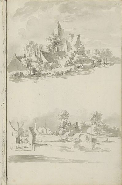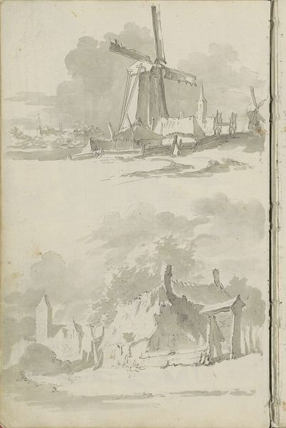 Curator: Allow me to introduce "Stadsgezichten met kerktorens en een landschap met molen," or "Cityscapes with Church Towers and a Landscape with a Mill," an ink and pencil drawing on paper by Barend Hendrik Thier, likely created between 1780 and 1800. Editor: Well, my immediate impression is this feels very dreamlike, almost ephemeral. It’s the muted palette, all these shades of gray on aged paper… the lines are so delicate. Like memories fading into the background. Curator: Indeed. Notice how Thier uses recurring motifs - the church spires acting as central pillars of each composition? Churches served as visual anchors within communities, symbolizing not only spiritual faith, but social stability. Their prevalence here seems deliberate. Editor: Absolutely, the spires do repeat as this beacon, don't they? Almost mocking our constant search and need of security? But there is such fragility to how these landscapes are sketched... I almost feel melancholic observing these ghostlike sceneries. It reminds me of that human need for peace. A sort of pastoral longing maybe? Curator: That’s astute. Consider also the windmill, featured in the lower register. Beyond its literal function for milling grain, the windmill, from a psychological perspective, embodies cycles, repetition, the turning of time and seasons. The ever-repeating cycles in these people's mundane routines? Editor: Good point, indeed, they represent repetition! These motifs feel comforting, because they're very traditional, so their repetition grants some hope. It also really illustrates the style of this time, which seems very neoclassical, like there are nods to Dutch Golden Age art. Curator: Precisely. You see this combination of neoclassicism and echoes of the Dutch Golden Age aesthetic – a kind of looking back while tentatively stepping forward into a new era. The toned paper itself carries its own history. Editor: Thinking of history here is interesting, I feel this sort of nostalgia with toned paper because that aged aspect connects me with time; I suppose people who observe this, in another two hundred years from now, will experience something similar about our contemporary art pieces as well. A cultural continuum. Curator: I think that hits the nail on the head. These sketches function almost as cultural palimpsests, inviting us to trace those echoes of continuity, change, and cultural memory within our collective visual lexicon. Editor: For me it emphasizes that quiet connection we can have to even the smallest glimpses into lives lived long before our own. Even if they are just fragments sketched on old paper.