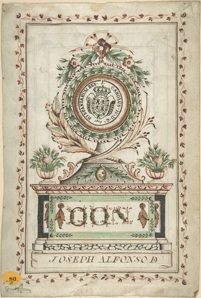 This ornament plaque, made by an anonymous artist, presents a symmetrical, decorative composition printed in a striking red ink. Two cherubic figures recline atop a cartouche, jointly holding a wreath enclosing a letter. The layout is carefully structured: the ornate frame at the base supports the cherubs, creating a visual hierarchy that leads the eye upwards. Notice how the lines, though delicate, define the forms and give the plaque its texture, hinting at depth despite the work's two-dimensionality. The chosen red, beyond its aesthetic appeal, can be read as a symbolic marker, perhaps alluding to passion or importance, depending on the cultural context. Consider the implications of such a structured and visually coded object. The symmetry speaks to a desire for order, the cherubs to innocence or divinity, while the inscription grounds the piece in a specific, proprietary reality. This plaque is not just a pretty picture but a carefully constructed message, inviting us to decode its layers of meaning.