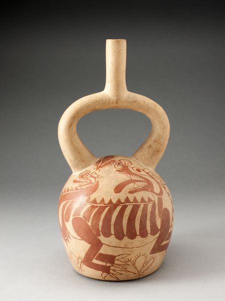 Curator: Well, what do you think of this piece? It's titled "Stirrup Vessel Depicting Anthropomorphic Fish, with Overpainting," created by the Moche people, likely sometime between 100 and 500 AD. You can find it here at the Art Institute of Chicago. Editor: Immediately, I’m struck by a feeling of playful solemnity. It's a vessel, so there's a functionality implied, yet that stirrup handle and the creature depicted on the body elevate it beyond mere utility. The terracotta color is lovely. Curator: The stirrup shape is quite distinctive, isn't it? Almost as if the vessel itself is some sort of mythical steed. I imagine it's so the contents don't spill too easily. I mean who knows? It could've held anything from water, to chicha or even blood? Editor: Exactly, and I think the form, the visual signifier, overrides any functional reading. Looking closer at the fish, those aren't scales but stylized designs! Is it holding a tumi? All these patterns…they're not just decoration, they must encode specific meanings, ancestral narratives perhaps. I almost get a totem animal sort of vibe here. What kind of fish is it, and what meaning might this particular sea creature have had in Moche culture? It all looks to be done in ceramic too! Curator: Precisely! Ceramics were often imbued with symbolic weight, serving not only practical purposes but also ritualistic ones. It is not quite like the Grecian Urns of that era. We should keep in mind this came from Peru. I would hazard a guess the vessel served a ceremonial use in a funerary rite. The shape could represent the life of a person in question. But then again I am no expert in anthropology. Editor: And I'm definitely no archeologist! Yet the form reminds me of ancient Mediterranean oil flasks, and perhaps this speaks to a human drive toward visual encoding when creating even basic household objects. Now to see it covered in symbols of an almost deity. Is this the artist's subconscious coming to life? Or the community's way of paying homage? Curator: Well, regardless, it sparks questions and connections across time and cultures, and I like how you touched upon both its symbolic depth and the common thread of human artistry, wherever it springs. Editor: Agreed! The playful solemnity and the stirrup steed that sprang into mind when first viewing this Moche master work still hold strong. There is just something comforting, maybe homely? Who knows, I might be projecting a bit.