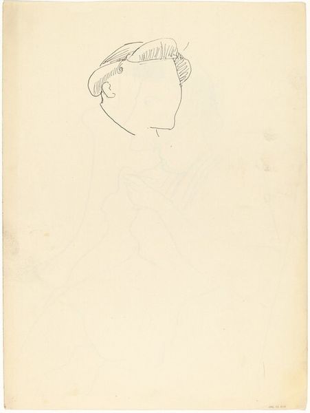 Editor: This is "Study of Head Facing Right," a pen and ink drawing on paper, by Mark Rothko. I am struck by the figure’s downward gaze and how lightly sketched it is. What do you make of it? Curator: It’s intriguing how Rothko uses the classical portrait as a symbol itself, before deconstructing it later in his career. Consider the traditional connotations: power, status, identity. But here, these are fleeting, almost ghostlike. How do you think he conveys this sense of ephemerality? Editor: Partly the medium – the quick pen strokes, unfinished lines… it suggests a sketch, something not intended to be permanent. Curator: Exactly! And that fleeting quality resonates. The subject gazes downward, perhaps introspective, weighted by thought. Consider how this differs from a Renaissance portrait, where the gaze is often assertive and outward-looking. Is Rothko engaging in a dialogue with that tradition? Editor: It definitely feels like a conscious subversion of it. Almost as if he's questioning the very idea of fixed identity or the importance of individual achievement. Curator: Precisely! The downward gaze carries cultural weight. It's a visual motif for contemplation, sorrow, even humility – emotions often suppressed in those traditional power portraits. Editor: So the symbols and their history inform how we read even this seemingly simple drawing? Curator: Absolutely. The power lies in understanding the ongoing dialogue between an artist and their visual inheritance. Seeing how Rothko takes a form so weighted with tradition, and empties it out – fills it with something new. Editor: I see that so clearly now, the ghost of older images shimmering through this one. It's made me consider the weight of art history differently.