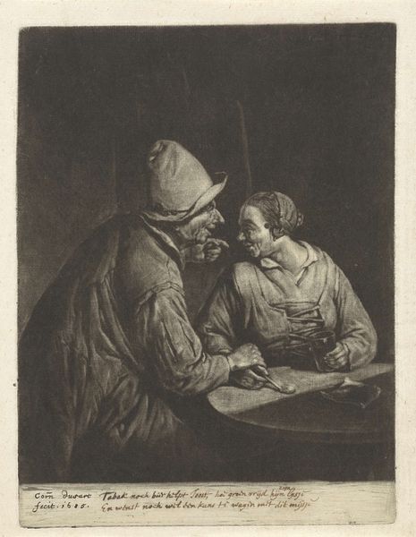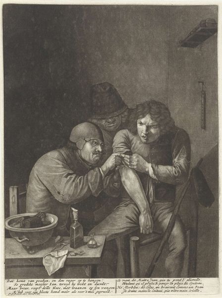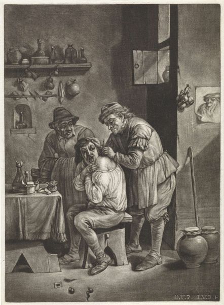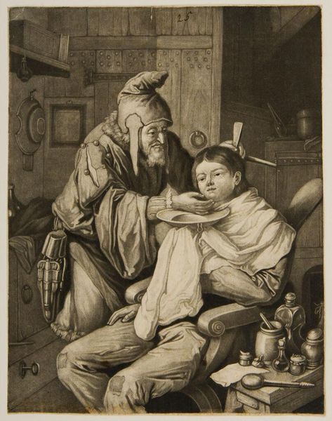 Cornelis Dusart created this artwork, Dorpsdokter, with engraving. Note the solemn ritual of healing captured here, the village doctor embodies a timeless figure, a guardian against the unknown forces of illness. The basin held beneath the patient’s chin is not merely functional; it echoes the vessels used in ancient bloodletting rituals, a practice intended to balance the humors of the body, linking this scene to centuries of medical tradition. Consider how the doctor’s hooded attire, reminiscent of a medieval alchemist or even a monastic figure, imparts an air of mystery and authority. This recalls similar garb in depictions of healers across cultures, from the plague doctors of the Renaissance to shamanistic traditions, where dress signifies a connection to otherworldly powers. The act of healing, then, is not just medical but deeply psychological, tapping into our collective memory of those who mediate between life and death. It’s a cyclical progression, how symbols resurface, evolve, and take on new meanings, each time engaging us on a subconscious level.