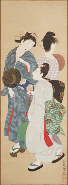 Curator: Ah, look at this. What feelings does it evoke in you? Editor: Immediately? Intimacy, definitely. A kind of serene protectiveness radiating from the mother. There's a tenderness in how they're positioned, close, but not quite touching. Like a gentle melody playing softly. Curator: You’re absolutely right. We're looking at a work entitled "Vrouw met kind," dating from around 1900 to 1917, by Kajita Hanko. It’s currently held in the Rijksmuseum's collection. What strikes me most is the powerful evocation of the Ukiyo-e style in its composition and narrative. These "pictures of the floating world" often depicted women in their domestic sphere, offering a look at contemporary life during the Edo and Meiji periods. What statements do you think it might make? Editor: The geometric blocks of the background feels both modern and jarring; they throw the softness of the image into high relief. Also the textures are fascinating, the patterns in their clothes look both complicated and really, really gorgeous. Almost like a collage. I keep wondering what they're thinking, if that little girl will follow in her mother’s footsteps… maybe not literally, you know? Times were changing. Curator: Indeed, it provides fertile ground for such ruminations. Let's consider the role of women in Meiji-era Japan, for example. This work can be seen as both a continuation of Ukiyo-e traditions and a reflection of early 20th-century modernism. The print allows us to see motherhood as a key aspect of feminine identity and societal roles during that historical moment. These artworks offer invaluable insights into complex subjects. Editor: Absolutely. Seeing it this way, with your emphasis on both context and complexity… Suddenly it hits harder. I am intrigued by this combination of tenderness and that certain edge from angular design choices! I want to go home and grab some blocks to experiment! Thanks, this gives you some major insight and freedom. Curator: And your spontaneous perspective infuses the work with vitality and potential meanings that resonate far beyond its original context. Thank you.