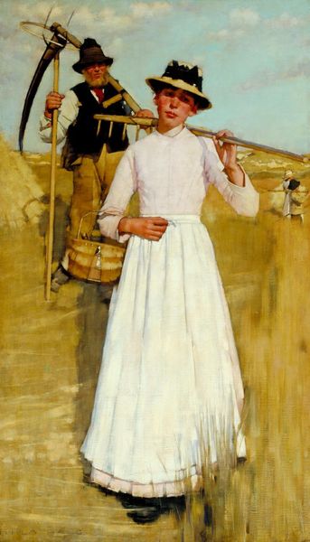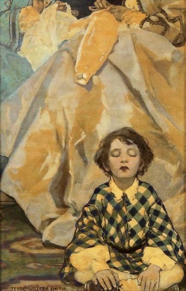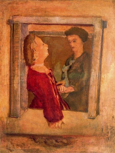 Editor: This is Augustus John’s "Gypsy in the Sandpit," painted in 1912, using oil paints. It feels…intimate, almost like a glimpse into a private moment, but there is also an undeniable formality. What do you see in this piece? Curator: What immediately strikes me is the manipulation of colour. Observe the earthy yellows and browns that dominate, creating a warm tonality. Then, John introduces cooler hues in the figures' garments – the blues and greens – thereby creating a formal and chromatic tension. Consider the rough, visible brushstrokes; they suggest immediacy, yet the composition itself is carefully arranged. Does the application of paint inform your perception? Editor: Absolutely. The brushstrokes do give it an unfinished feel. And now that you mention it, the limited palette is very effective. What’s the impact of the figures' positions relative to each other and their relationship to the foreground and background? Curator: A brilliant question! The figures exist within an ambiguous spatial relationship, flattening of perspective to heighten visual tension. They’re occupying a foreground defined by texture, a "sandpit," and in their placement we find contrast. Notice also how John uses colour and texture not for illusionism, but to draw the viewer's attention to the act of painting itself. It transcends pure representation. The real subject here is the act of seeing, no? Editor: It does give you a lot to consider; seeing the composition, colours, and brushstrokes as separate elements makes you understand the overall design so much better. Thank you for pointing this out. Curator: My pleasure! It is by studying and examining the internal grammar and lexicon of visual language that we move closer to grasping an artwork’s very essence.