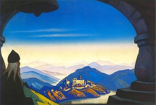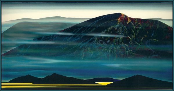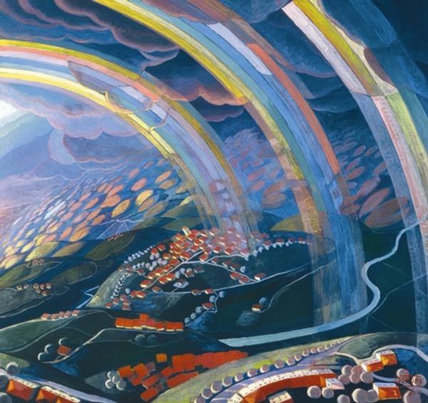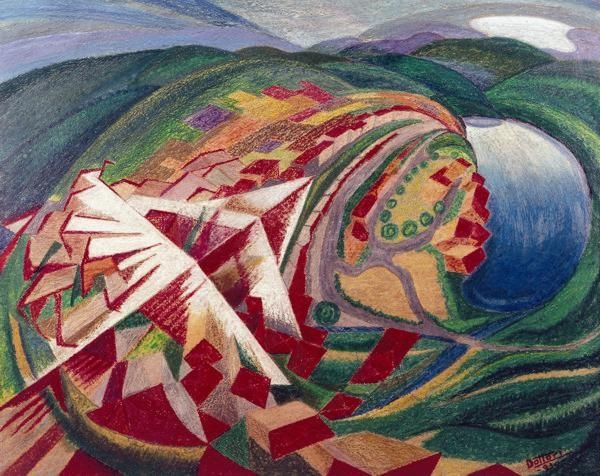 Here is a painting by Gerardo Dottori, titled “Primavera Umbria.” The entire composition seems to bend and curve, inviting us into the pictorial space through the dynamism of its lines. The artist uses a wide-angle perspective, almost as if viewed through a fish-eye lens, to distort the landscape into a vortex of color and form. The artist uses bright greens and blues to create an illusion of depth, with bands of color overlapping in a circular configuration. This is achieved through distinct brushstrokes and contrasting shades, which emphasizes the undulating rhythm of the countryside. The overall effect is a harmonic symphony of natural and geometric shapes. The painting, therefore, functions as a window into a world that is both familiar and strange. It challenges us to reconsider our relationship with the world, and the structures through which we view it.