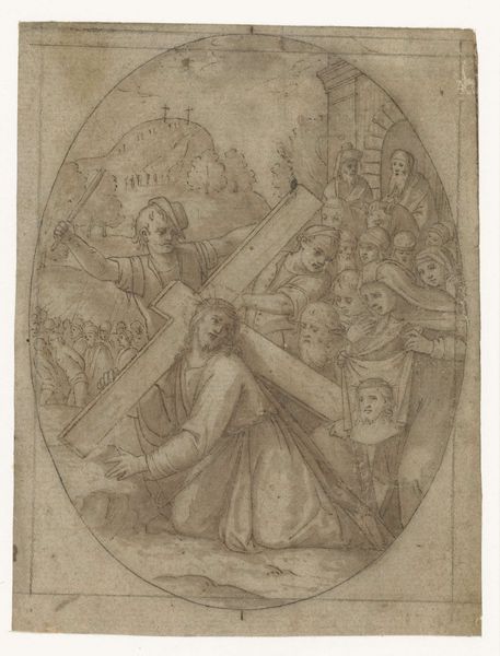 Curator: This drawing, "Crucifixion," is by Pieter Coecke van Aelst, who died in 1550. Look at the detail achieved through ink on paper. It's currently held at the Harvard Art Museums. Editor: The emotion is so raw. The upward gazes, the chaotic crowds... it's dominated by anguish. The three crosses loom, but the real drama is in the foreground figures. Curator: Absolutely. The artist's process of layering the ink to create depth is intriguing. Consider the paper itself, likely handmade, and the labor involved in its creation. Editor: And the choice of this scene! The cross, of course, is laden with meaning – sacrifice, redemption, but also suffering. It's a potent visual shorthand. Curator: The rapid mark-making also speaks to the urgency, reflecting both the historical moment of production, and the immediate artistic concerns of Coecke van Aelst. Editor: Seeing it this way, it’s more than just a religious scene, isn't it? It is a study of human emotion under the weight of powerful symbols. Curator: Indeed. The work invites speculation about its role in the artist’s practice and the broader artistic culture of its time. Editor: A brutal, beautiful, and lasting visual testament. Curator: A powerful testament, carefully wrought.